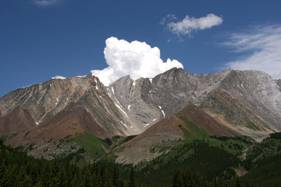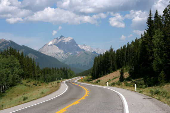 Jedziemy cały czas lekko pod górę. Nachylenie chyba ani przez chwilę nie przekracza 5%. Na postojach okrutnie dokuczają nam muchy - z pozoru zwyczajne, ale z bolesnym ukłuciem wgryzają się w ludzkie ciało! Na każdym postoju tłuczemy ich dziesiątki, ale niewiele to pomaga. W dodatku słońce strasznie przygrzewa. Otaczają nas potężne góry, przejeżdżamy nad malowniczymi strumieniami. Niedaleko przełęczy motocykliści jadący z góry ostrzegają nas, że widzieli czarnego niedźwiedzia przy drodze. Od tej chwili Małgosia ostro gwiżdże w gwizdek. Widujemy jednak same susły, niedźwiedzia ani śladu. Około godziny 15 zdobywamy najwyższą przełęcz drogową Kanady - Highwood Pass znajdującą się na wysokości 2227 m n.p.m. (lub 2206 m, jak piszą gdzie indziej). Na przełęczy pasie się stado owiec amerykańskich (Rocky Mountain sheep). Widujemy też prawdziwe, wielkie kruki, których nie widuje się w Polsce.
