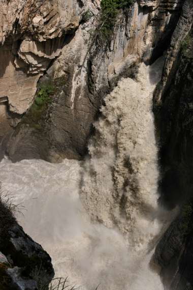 Całą noc pada deszcz. Rano też chwilami pada. Na szczęście namioty Hannah działają jak trzeba. Decydujemy, że przejedziemy kawałek z powrotem - do wodospadów Sunwapta Falls. Wodospad jest potężny - szeroka rzeka przepływa przez kilkumetrową szczelinę w skale. Jedyne zastrzeżenie to brudna, beżowa woda po deszczu, która trochę obrzydza widok.