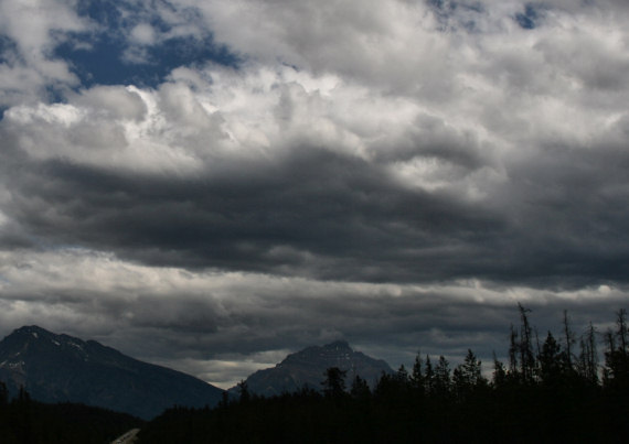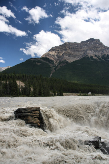 Na niebie są fajne chmury - niektóre płyną dość nisko i ocierają się o góry. Niebo jest niebieskie. Niedługo później chmury jednak zwyciężają i robi się szaro. Robimy kolejny postój przy kolejnych potężnych wodospadach - Athabasca Falls.