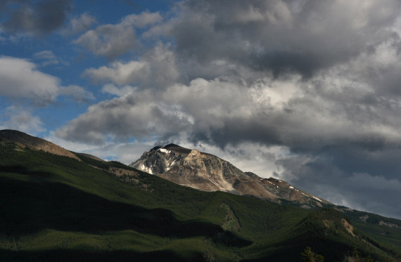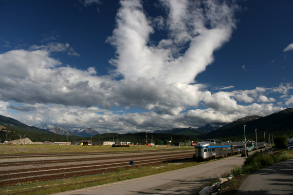 W Jasper na szczęście robi się jako taka pogoda. Zjeżdżam do dostrzeżonego sklepu rowerowego. Nowe pedały kosztują $75. Na łożysko do pedału musiałbym czekać tydzień. Wychodzę ze sklepu i widzę przejeżdżających Gosię i Pawła, którzy byli trochę w tyle. Wołam, ale mnie nie zauważyli. Gdzieś dalej ich doganiam. Umawiamy się, że gdzieś ich złapię na ławce po tym jak znajdę inny sklep rowerowy i zmienią mi pedały. Sklep znajduję, wybieram najtańsze pedały Wellgo pasujące do moich bloków. Za $45 mam pedały platformowe SPD. W międzyczasie robi się ładna pogoda, góry są pięknie oświetlone i mają dodatek malowniczych chmur. Z Jasper jest piękny widok na góry z wszystkich stron. Spożywamy posiłek na ławce z widokiem na dworzec kolejowy i góry. Robię masę zdjęć.