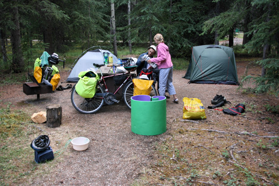 Kawałek wcześniej rozwaliło mi się łożysko w pedale (Shimano PD-M505 z 2004 roku). Przejechało 9000km. Moim zdaniem to nie jest dystans, po którym ma prawo się łożysko rozwalić. Kulki po trochu się wysypują, ale jakoś da się pedałować. Całe szczęście, że do Jasper jest jakieś 25km w dół rzeki. Gosia z Pawłem decydują się pojechać boczną drogą 93A. Ja z moim łożyskiem wolę jechać najprościej jak się da. Kilka kilometrów przed Jasper, gdy czekam na poboczu na małżeństwo, zaczyna się porządny deszcz.