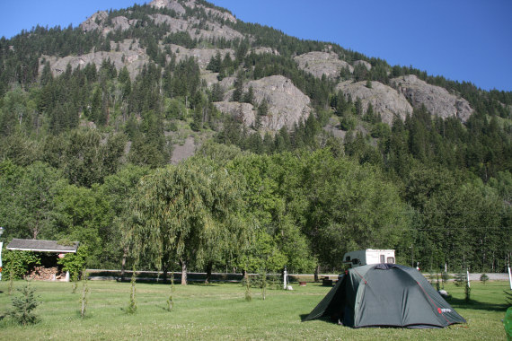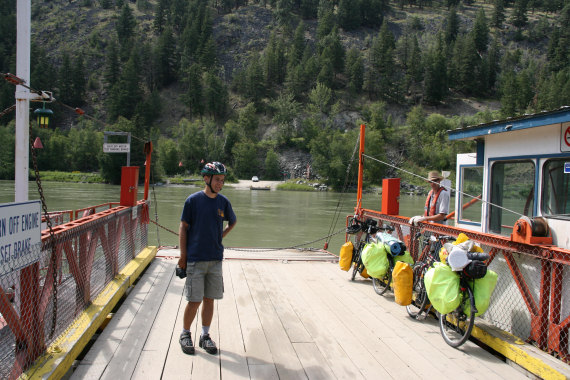 Jechaliśmy do późna, więc i ruszamy później niż wczoraj. Krajobraz robi się coraz bardziej południowy. Góry są wysuszone, a duże ich połacie spalone pożarem. Nie ma już takich gęstych lasów, lecz głównie suche lasy sosnowe. Gdy się rozejrzeć, zazwyczaj dominuje żółć, beż, brąz, szarość. Znowu jedziemy aż 51km bez przerwy - do pierwszego rest area z ławkami. Liczymy wagony rekordowego pociągu - 175 sztuk! Jest paskudnie gorąco. Z rest area zjeżdżamy mniej więcej na poziom rzeki. Podjeżdżamy do pierwszego domu po prawej i z dwoma dziewczynkami negocjujemy nalanie wody do butelek. Zasięgamy też informacji na temat promu, z którego zamierzamy skorzystać. Gdy dojeżdżamy do promu, okazuje się, że nie ma on silnika. Co nie znaczy, że nie pływa :) Taki po prostu sprytny jest, że napędza go prąd rzeki.