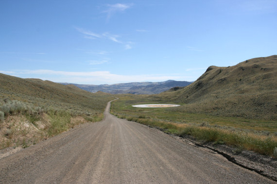 Jedzie się cały czas szutrem, w miarę dobrze ubitym. Śmieszna taka jazda bez sakw, szczególnie na początku rower chybocze się na boki. Początkowo pedałujemy strasznie pod górę, później trochę pod górę, dalej znów strasznie pod górę, a potem trochę po płaskim. Gdy zrobiło się już płasko, byliśmy tak zmęczeni, że odechciało nam się dojeżdżać do samego jeziora, mimo iż było już dość blisko. Mijamy tylko kilka mniejszych, wysychajacych jezior. Gosi kolano raczej działa, Pawła koło również. Droga powrotna wiedzie głównie w dół, co daje przeogromną radość, gdyż okazuje się, że było jeszcze bardziej stromo niż się wydawało. Na długiej prostej z górki osiągam na tym szutrze 70km/h.