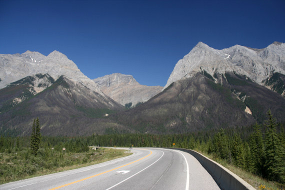 Po nieuzasadnionym podjeździe, droga wraca na poziom rzeki. I tak się jedzie w górę i w dół, w górę i w dół. Widoki piękne, ale te ciągłe podjazdy są dobijające! W pobliżu latają wielkie ptaki drapieżne. Gdzieś tu wjeżdżamy do Parku Narodowego Yoho. Krajobrazy Gór Skalistych pod bezchmurnym niebem są niesamowite. Im bliżej przełęczy, tym trasa robi się rozsądniejsza - bez zbędnych zjazdów, łagodnie w górę. Góry w świetle zachodzącego słońca zyskują dodatkowego uroku.