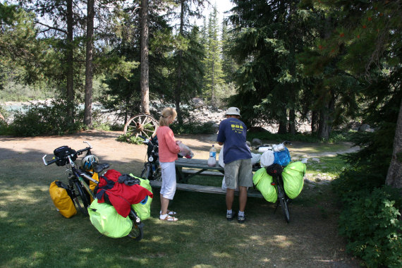 Z przełęczy nie ma specjalnych widoków, ale może to wrażenie, które spowodowała pogoda. Jesteśmy z powrotem w Lake Louise po 18 dniach. Robimy zakupy i odpoczywamy w świetnym miejscu nad rzeką.