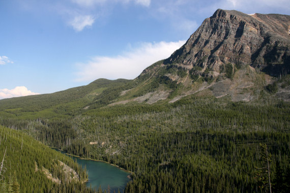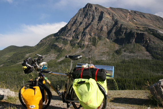 Pedałujemy pod górę, znów pomiędzy góry. Tutaj od razu jest ciszej i milej, droga jest typowo turystyczna i raczej boczna, nie ma tu ciężarówek. Za to jest bardzo stromo, od razu zaczyna się podjazd na przełęcz Vermillion Pass. Trochę poprawia się pogoda, powietrze robi się przejrzyste. Na przełęczy znowu przedostajemy się do zlewiska Oceanu Spokojnego, tym samym wjeżdżając do parku narodowego.