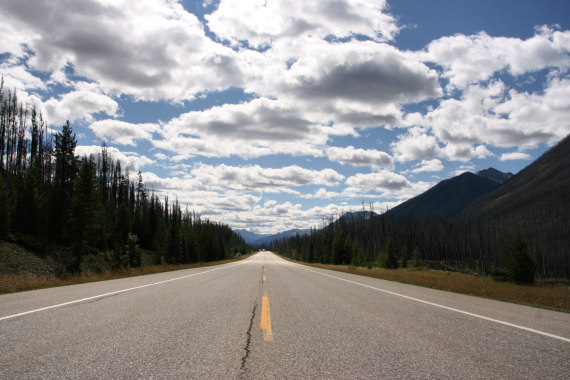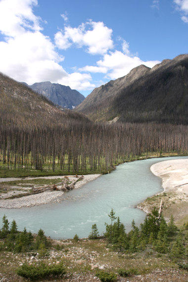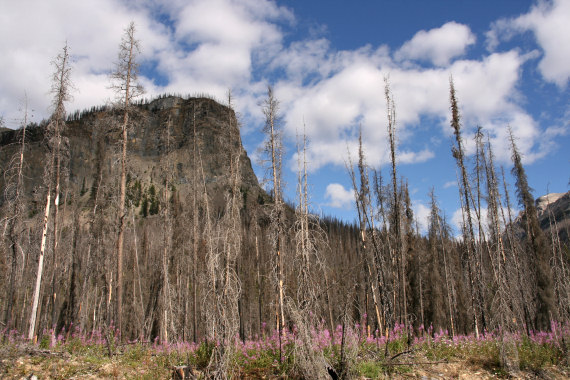 Wzdłuż trasy są duże obszary spalonych lasów z rzucającymi się w oczy polami różowej wierzbówki rosnącej między poczerniałymi pniami sosen. Oczywiście wszystko otoczone jest pięknymi górami. Droga nie jest zbyt ruchliwa, więc w sumie Park Narodowy Kootenay robi bardzo pozytywne wrażenie.