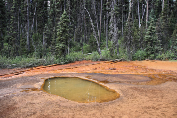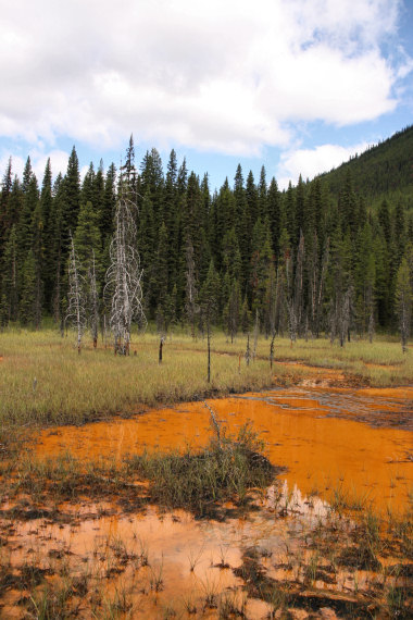 Rano przejeżdżam kilka kilometrów i parkuję na parkingu, gdzie stoi pełno samochodów. Tutaj zaczyna się szlak pieszy do Paint Pots - wywierzysk i źródeł barwiących okoliczną glebę na kolor pomarańczowy. Same źródełka nie są wybitnie malownicze - wyglądają jak kałuże na szczycie niedużego kopca. Niemniej jednak, krystalicznie czysta woda płynąca po czerwonej ziemi wygląda fajnie. Szlak jest obliczony chyba na emerytów. Tabliczka informuje, że idzie się 20 minut w jedną stronę, a ja w tym czasie przemaszerowuję trasę w obie strony.