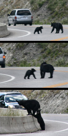 Kawałek przed przełęczą widzę małego czarnego niedźwiadka przechodzącego przez drogę. Po prawej stronie jest stok porośnięty nieregularnym lasem, po lewej stromy spad w dół. Miś chce przejść na lewo, jednak z powodu betonowych zapór zapobiegających spadaniu samochodów w przepaść nie może się tam przedostać. Z dołu wychodzi jego matka i w końcu obchodzą razem te zapory dookoła. W międzyczasie zatrzymało się pełno samochodów. Ja trzymam się w bezpiecznej odległości - ok. 100m, bo matka z niedźwiadkiem to maszyna do zabijania. Robię kilka zdjęć, ale ze zbyt daleka, żeby były fajne.
