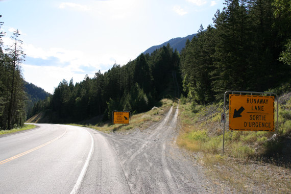 Na przełęczy napotykam znak z profilem zjazdu. Jest to informacja szczególnie dla kierowców ciężarówek, dzięki czemu wiedzą, gdzie czekają ich najbardziej strome fragmenty. Po raz pierwszy widzę zjazdy awaryjne dla kierowców, których pojazdy utraciły zdolność hamowania. Na delikatnym łuku w lewo, na wprost odchodzi prosta droga, która jest bardzo stroma, co pozwala na wyhamowanie delikwenta.
