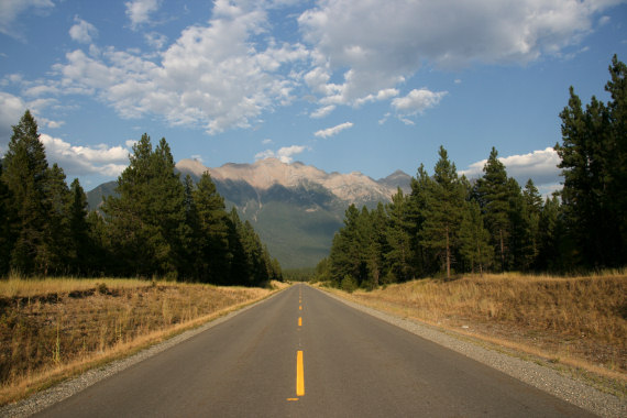 Robi się już późno. Odbijamy na boczną drogę, która ma nas doprowadzić do Norbury Lake Provincial Park, a jutro do głównej drogi nr 3. Zbliżamy się znowu do porządnych, pięknych gór. W świetle zachodzącego słońca wszystko wygląda pięknie. Pusta droga, przyjemne chmury na niebieskim niebie i widok na góry.