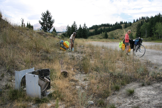Jakoś bardzo fajnie się jedzie wzdłuż rzeki do Fernie. To tutejszy kurort narciarski. Czekam na małżonków przy wjeździe do miasta. Jedziemy razem do centrum, pytamy o jakieś campingi i decydujemy się na powrót kilka kilometrów, do parku prowincjalnego Mount Fernie. Zjazd do niego jest mniej więcej tam, gdzie czekałem. Podjeżdża się okrutnie stromą dróżką. Wjeżdżając pod górę słyszę szelest na dole głębokiego zbocza po lewej stronie drogi. Zjeżdżam na lewą stronę, żeby spojrzeć w dół, a tam czarny niedźwiedź pożera coś z krzaka. Wołam ich, żeby zerknęli, bo miś jest w bezpiecznej odległości na dole, ale boją się :)