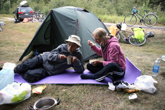 Na campingu nie ma miejsca, ale jest trawniczek "overflow" dla nadprogramowych gości. Pani obsługująca camping bardzo przeprasza, że nie będziemy mieli własnej ławki. Sakwy na noc chowamy do pomieszczenia gospodarczego, rano musimy trafić w moment, kiedy będzie ktoś z obsługi, żeby je wydostać.