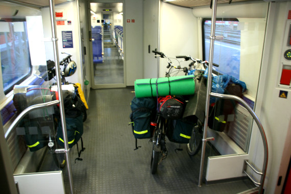 Okazuje się jednak, że jest to jakiś bawarski ekspres, który nie podpada pod ogólne koleje niemieckie, przez co nie możemy kupić biletu. Konduktor nie za bardzo chce wytłumaczyć, dlaczego nie może nam sprzedać biletu, nie chce w żaden sposób pomóc i jeszcze narzeka, że nasze rowery zajmują całe wejście do pociągu (podczas gdy miejsca na rowery są zajęte przez osoby bez rowerów i w ogóle bez bagażu, co konduktorowi nie przeszkadza). Summa sumarum: nie posiadając biletów, uciekamy z pociągu na następnej stacji. Zabieramy się za składanie rowerów do kupy, co zabiera nam trochę czasu. Pawłowi w dodatku zeszło powietrze z dętki. Gdy on zmienia dętkę, ja biegnę kupić bilety. Jest to strasznie problematyczne, ponieważ muszę kupić kilka biletów lokalnych w automacie na monety i drobne banknoty i kilka regionalnych w drugim automacie na kartę. Monet ani drobnych banknotów nie mam, więc muszę rozmienić w jakimś kiosku. Ogólnie zajmuje to dużo czasu, a w dodatku pomyliłem sobie czas odjazdu o 5 minut. Gdy więc biegnę na pociąg, jest już kilka minut po czasie. Na szczęście Gosia z Pawłem załadowali wszystko i uprosili konduktora, żeby stał (co w Niemczech niekoniecznie bywa łatwe). Dalej podróż przebiega bez zakłóceń.