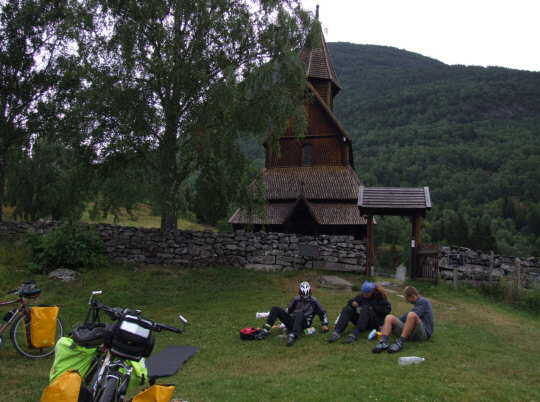 Pogoda jest nijaka. Niebo całe szare. Wkrótce wysiadamy w Urnes i podjeżdżamy pod stromą górę do tutejszego kościoła słupowego znajdującego się na Liście Światowego Dziedzictwa UNESCO. Nic nadzwyczajnego, prawie niczym się nie różni od tego wczorajszego. Przed kościołem jest idealny trawnik do rozłożenia się na śniadanie, którego jeszcze nie jedliśmy.