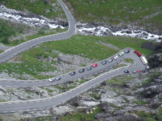 Podjazd jest nawet znośny. Wkrótce roślinność karłowacieje, a później zupełnie znika. Ludzie w kilku mijających samochodach filmują mnie kamerami :) Przez puste, surowe góry poprzetykane strumieniami, jeziorami i rzadką trawą dojeżdżamy do zapchanego parkingu przy punkcie widokowym na Drogę Trolli. Jest tu dużo punktów sprzedaży pamiątek i masa ludzi. Niedaleko naszych rowerów stoi żółty Chevrolet Corvette. Spędzamy tu trochę czasu robiąc zdjęcia, po czym rozpoczynamy zjazd wąską drogą, na której każdy większy samochód ma problemy z pokonaniem zakrętów.