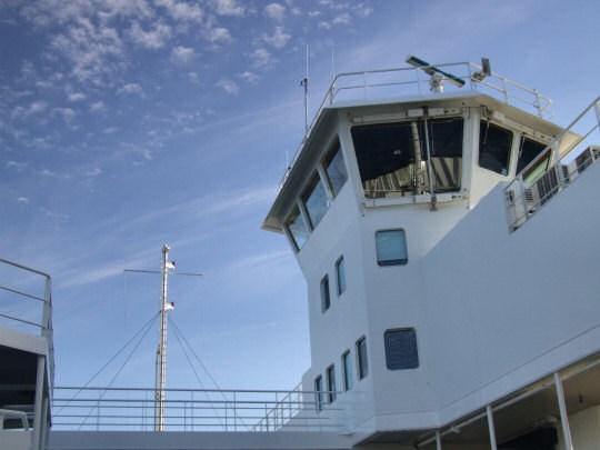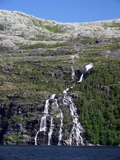 Wstajemy bardzo wcześnie. Nie pamiętam konkretnej godziny, ale po zjedzeniu kaszki ruszamy o 6:20 na przystań. Widać w oddali zbliżający się prom, więc jednak go naprawili (co nie było takie pewne). Niemcy śpią w najlepsze. Jesteśmy jedynymi pasażerami. Prom ma dość krętą trasę - prawdopodobnie omija jakieś mielizny oznaczone latarenkami. Ma też jeden przystanek po drodze. Tu wjeżdżają już jakieś samochody. Sprytnym sposobem unikamy opłaty - usiłuję zapłacić banknotem 1000NOK (nie mam nic mniejszego), a pan kasjer tak wcześnie rano nie ma jeszcze z czego wydać :)