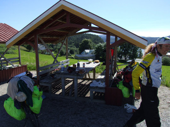 Musimy nieco zmienić trasę, ponieważ tam gdzie zamierzaliśmy jechać jest znak, że na drogę pospadały jakieś głazy i jest nieprzejezdna. Na skrzyżowaniu na 50-tym kilometrze spotykam starszego, około 60-letniego, siwego sakwiarza. Mówi, że jedzie z Nordkapp, przejechał 1300km i ma za sobą 18 deszczowych dni. Ten jest pierwszy pogodny. Nieźle nam wróży... Ale może nie będzie aż tak źle? Żegnamy się, ruszam w drogę i tu słyszę trąbienie Pawła (dodajmy, że posiada on trąbkę Airzound... dla nieobeznanych - głośność podobna do klaksonu ciężarówki tudzież lokomotywy). Okazuje się, że odkryli market kilometr stąd. Co prawda nie na naszej trasie, ale czego to człowiek z głodu nie robi. Na ławeczce przy markecie urządzamy ucztę (czytaj: zjadamy dużo chleba, niemniej jednak warto zauważyć, że norweskie chleby są bardzo dobre).