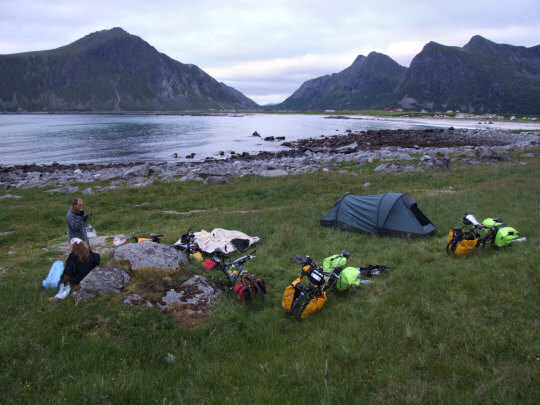 Około 18 jesteśmy na miejscu. Lofoty nam się podobają, ale niestety pogoda wciąż jest pochmurna. W wodzie widać pełno meduz, niektóre są naprawdę wielkie - o średnicy około 50cm, a długości tych wszystkich ogonów do 2m. Mamy ubaw z Pawła, który brał tutejszego popularnego, niedużego ptaka brodzącego za maskonura :) Dodam, że ptak ten do maskonura nie jest w ogóle podobny :) Nowa opona wyraźnie buczy podczas jazdy po asfalcie.