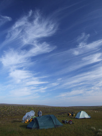 Nie ma ani jednego drzewa w zasięgu wzroku. Jedzenie się nam powoli kończy - po południu ciągnę na samych ciastkach. Pechowo, akurat wczoraj skończyły nam się zupki i kaszki, więc nawet ugotować nic nie można. Większość ekipy uciekła mi, gdy nabierałem wody, ale doganiam ich, gdy robią sobie postój nad jakimś jeziorem. Paweł śpi :) Chwilę siedzę z nimi, po czym ruszam dalej. Niedługo później zaczyna się naprawdę paskudna żwirowa droga. Robiona jest nowa nawierzchnia, ale na odcinku około 10km jest nieznośny żwir, po którym ciężko się jedzie. Co najgorsze, samochody wzbijają niesamowite chmury pyłu. Jedyny radosny fakt to to, że samochód pojawia się raz na 10 minut. Mniej więcej wraz z końcem żwirowej drogi, kończy się niebieskie niebo - morze chmur napływa nad nas. Przed zjazdem do kolejnego fiordu rozsiadam się na ławce i czekam na resztę. Dalej mniej więcej razem jedziemy przez pagórki i wciąż pod wiatr, wzdłuż wybrzeża. Gdzieś tutaj wybiega mi na drogę pełno kuropatw lub innych przepiórek. Większość wzbija się w powietrze i ucieka, a jedna nie potrafi wzbić się i biegnie przed moim rowerem wymachując skrzydłami w panice. Zjeżdżam na lewą stronę drogi, żeby ją wystraszyć na prawą stronę drogi - mogłaby sobie spokojnie skoczyć w krzaki i schować się przede mną. A ten ptasi móżdżek biegnie za mną na lewą stronę drogi i dalej ucieka w panice. W końcu się zatrzymałem i pozwoliłem ptakowi zwiać w spokoju. Myślałem, że takie głupie stworzenia to tylko w kreskówkach :)