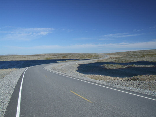 Jazda po płaskowyżu jest nieznośna - trzeba walczyć z silnym wiatrem. Początkowo jedziemy przez wzdłuż mokradeł, co sprawia, że nie ma gdzie nabrać czystej wody. Zjeżdżamy do fiordu Eidfjord (pełno fiordów w Norwegii nosi tą nazwę), okrążamy go i podjeżdżamy pod górę paskudną drogą w remoncie. Wzdłuż niej stoi pełno różnych maszyn, leżą składowane rury, deski i materiały do konstrukcji mostu (niektóre leżą na paletach PKP). Droga biegnie wzdłuż rzeki, do której ciężko zejść, ale na szczęście są też nieduże, dopływające do niej strumyki. W jednym z nich wreszcie nabieram zapas wody i mogę się napić do woli. Po dokończeniu paskudnego podjazdu, znowu jedziemy pagórkowatym płaskowyżem. Widok po horyzont to kamienista pustynia, gdzieniegdzie przeplatana jeziorami.
