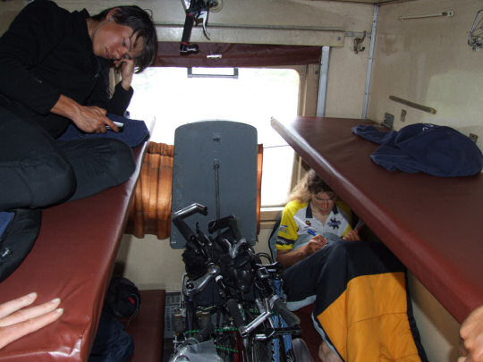 Dzień 38 11.08.2006 Piątek Cała dzisiejsza doba to jazda pociągiem. Miła odmiana, wreszcie możemy porządnie wypocząć. Dokańczam "Trzy Wiedźmy" Pratchetta. Paweł i Tomek odpoczywają aż przesadnie - prawie non stop śpią! Przez okna nie ma co oglądać, bo zgodnie z polityką ZSRR, wzdłuż torów wciąż są gęste krzaki lub drzewa. Tylko w okolicach stacji można coś dostrzec. Za to po raz pierwszy od ponad miesiąca zobaczyliśmy prawdziwą, ciemną noc. |