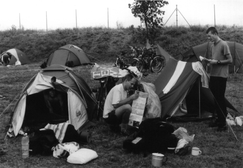 Pole namiotowe w Wiedniu. Rzeczy suszą się gdzie popadnie, Paweł studiuje mapę.